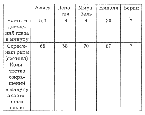 […] Ниже, в таблице, представлены результаты четырех электрокардиограмм и электроэнцефалограмм, снятых у разных личностей Алисы в ходе различных медицинских обследований. Наиболее характерными представляются такие показатели, как частота движений глаза в минуту и частота сокращений сердца в состоянии покоя.