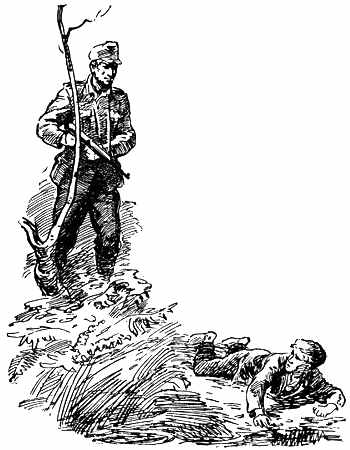 Павлик не поверил в доброту немца. Сквозь сухие стебли он начал целиться в его грудь. Нажал на курок. Осечка. Патроны отсырели во время дождя. Он снова прицелился — и снова осечка… А унтер-офицер, стоя по грудь в воде, продолжал кричать: «Дальше не иди — утонешь, утонешь!» «Почему он не стреляет? — не понимал Павлик. — Может быть, он действительно боится, что я утону? Он какой-то странный. Немцы аккуратные, выбритые, а этот весь зарос и… и почему-то все время испуганно озирается по сторонам?»