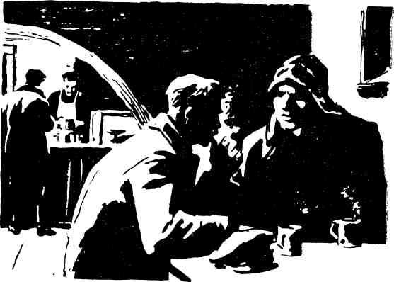 ...Войдя в подвал, Иван Глыба огляделся. За двумя столиками, сколоченными из ящиков, расположились какие-то люди. Перед ними стояли жестяные кружки с кофе, от которых к потолку поднимался густой пар. В подвале было сыро, накурено, с потолка изредка падали темные капли. У стойки дымно чадила сделанная из медной гильзы коптилка. На стенах шевелились уродливые тени.