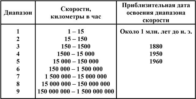 Чтобы убедиться в справедливости сказанного, составим таблицу, в которой перечислим все мыслимые диапазоны скоростей, расположив их в порядке возрастания, и укажем с точностью до десятилетия дату освоения каждого нового диапазона. Результаты получаются поистине ошеломляющие: