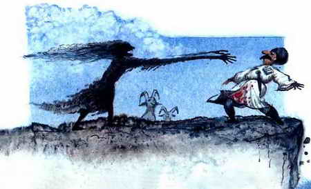 Взобрался он на гору и думает: «Теперь она меня не найдёт!» Только он это подумал, как появилась перед ним сожжённая женщина и стала тянуть к нему руки.