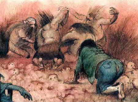 На следующий день к краю котловины подъехали две машины. Из одной вытащили шланг, и по нему в котловину пошёл сернистый газ. Через несколько часов газ заполнил всю котловину, из неё стали доноситься ужасные стоны и крики всю жизнь молчавших вампиров. Крики стали стихать. Вдруг за край обрыва стали цепляться чьи-то руки с огромными ногтями. Это был последний вампир. Над поверхностью медленно показалась голова. Вдруг глаза открылись широко-широко, лицо всё напряглось, шов на губах лопнул, и люди услышали страшный крик последнего вампира. Когти разжались, и мёртвое тело рухнуло в котловину [17] .
