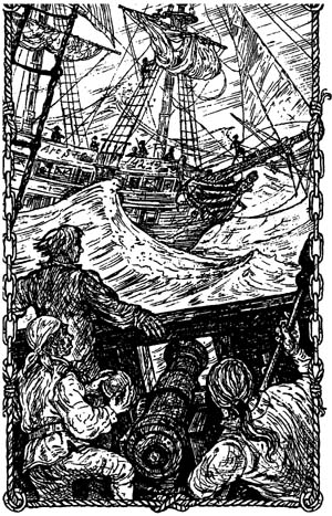 Казалось, он приближается неимоверно быстро. Эбби суетился у пушек, но мне его заботы казались никчемными. Он мог всадить лишь каких-то восемь фунтов железа в двухсоттонный парусник. Глаз его сверкал. Круглая голова сияла красным платком. Хлопотал он основательно и отважно, с храбростью Нельсона. Под пушки загнали клинья, чтобы опустить стволы, кремневые замки взведены, спусковые шнуры в руках у Маджа и самого Эбби.