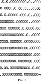 Чтобы освободиться от графических задач, рассмотрим другую форму лабиринта. Его создание составляет головоломку, а использование — игру. Пусть дана прямоугольная область, образованная n строками с p полями на каждой из них. На моем компьютере, где приходится учитывать формат экрана, числа n = 12 и p = 20 дают хорошие результаты. Занятые места считаются препятствиями (обозначенными здесь 0), пусть как-то помечены свободные места (здесь — точкой), пусть значок * обозначает всадника. Конь перемещается, как конь в шахматах: два шага в одном направлении и еще один шаг перпендикулярно предыдущему направлению. Конь может перемещаться только с одного свободного места на другое, В начальный момент он находится в правом нижнем углу. Он должен попасть в верхний левый угол (который, таким образом, тоже должен быть свободным). Число ходов игры ограничено. На рис. 1 изображен типичный пример лабиринта.