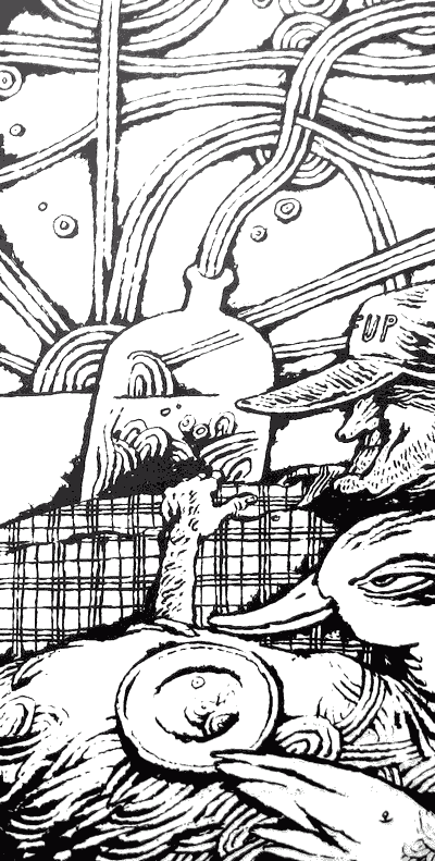 Предупреждение звучало разумно, ибо свирепость Какшы была под стать аппетиту. Как-то ранним вечером, еще в те времена, когда вес ее измерялся всего лишь унциями, Какша осмелела настолько, что выбралась на крыльцо, где тянул свой виски Дедушка. В ответ вечно сонный кунхаунд по кличке Кутила погнал ее к ободранному зеленому дивану, под который она тут же забилась. Когда пес, вняв наконец дедушкиным тычкам в голову, растянулся на крыльце, чтобы поскулить и заснуть опять, Какша выскочила из убежища, с коротким «ПИИИИИП!» заправского камикадзе, словно крепчайшими клещами, вцепилась клювом в обвисшую Кутилину мошонку и яростно держалась за нее все то время, пока кунхаунд с воем носился по кругу, силясь ухватить болтавшуюся у него на бурдюке полуфунтовую уточку. Дедушка хохотал так, что пришлось сползать с крыльца и биться головой о землю — иначе остановиться он не мог.