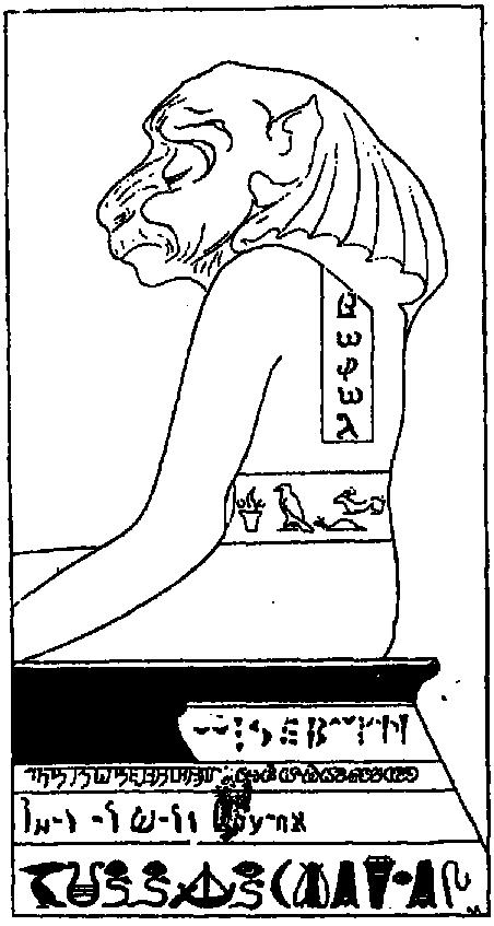 Это мудрый павиан, самый мудрый из зверей Южной Африки. Я нарисовал его со статуи, которую выдумал из своей головы, и написал его имя на поясе, на плече и на скамейке, где он сидит. Написал я это особенными значками, потому что он так необыкновенно мудр. Я хотел бы раскрасить этот рисунок, но мне не позволили. На голове у павиана нечто вроде зонтика: это его грива.
