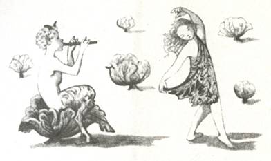 Спустя некоторое время Пан, сидя на скале, извлекал из флейты пронзительные и веселые звуки. Вдруг он в изумлении увидел перед собой свою приемную дочь, которая церемонно приветствовала его. Поощряемый улыбкой ребенка, он продолжал выводить мелодию, но изумление его дошло до предела, когда он увидел, как Кастелла, более гибкая и грациозная, чем лесные нимфы, двигает ручками и ножками в такт его флейте. Вот тут-то Пан дал волю своей фантазии: самые причудливые «скерцо» сменялись нежными «анданте», и Кастелла танцевала то неистово бурно, то плавно и медленно, до тех пор пока от усталости у нее не подкосились ножки. Тогда юный бог взял ее на руки и нежно поцеловал. Музыка приобрела для него новый смысл.