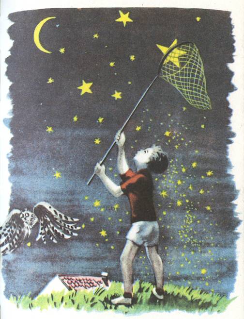 Маленькая звездочка проскользнула по небу, но не исчезла, как другие, среди больших планет, а сделала крутой поворот и стала плавно спускаться к холму. Сначала она прошла над головой Марка, сбросив на него блестящую искорку и заговорщически подмигнув ему, затем сделала еще круг, потом еще, на этот раз совсем близко от земли. И вдруг Марк почувствовал, как что-то очень тяжелое упало в сачок, который он держал в поднятой к небу руке. Это была звезда.