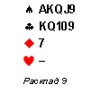 В раскладах 9 и 10 другие виды раскладных взяток. Здесь также высокая вероятность дополнительных взяток в трефе и целесообразно торговаться до контракта 8
