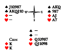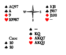 Теперь посмотрим, что может случиться, если мы закажем козырем трефу. Даже при своём ходе мы можем сесть на семерной без двух при таком раскладе: