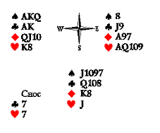 Ещё одно соображение, которое следует иметь в виду при заказе игры, точнее — аспект, в котором сосредоточена масса разнообразных соображений, — это безопасность и целесообразность — различная тактика при игре в «сочинку» и «ленинградку», а также при игре в «гусарика» (см. в первую очередь таблицу стоимости игр, Приложение 1 ). Нет смысла повторять, что в различных разновидностях соотношение между играми различно, и, следовательно, вы всегда делаете выбор в пользу оптимального решения, которое соответствует вашим планам. Представьте, что вы играете в турнире, который хотите выиграть. Перед последним туром вы прилично отстаёте. Вам приходит карта: