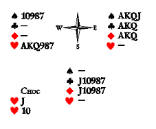 Ход чужой. Какую игру заказать? Вы видите все опасности убиток, особенно перекрёстных, что с учётом сноса весьма вероятно, и заказываете 7 без козыря. Эту игру проиграть нельзя, так как при любом ходе и раскладе вы успеете получить по крайней мере одну взятку на один из марьяжей. Но теперь поставьте себя на место вистующих и предложите план розыгрыша на открытых картах: