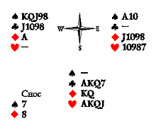 Какие возникают идеи? Кого возьмёте? Выиграете восьмерную, играя за Юга, или посадите, выбрав вистующих? Изучим расклад. Чёрные масти лежат благоприятно для Юга: пиковая десятка и трефовая дама берут взятки на третьем ходу розыгрыша масти (в пике на второй ход дамой падает валет, а в трефе на второй ход десяткой падает король). План разыгрывающего сводится к тому, чтобы отдать ход опасному вистующему на ранней стадии розыгрыша. Вистующие начнут, очевидно, с одной из красных мастей, пытаясь выработать себе лишнюю взятку. Поэтому Югу нужно сначала разыграть трефу. Когда он переключится на пику, у Запада не окажется третьей карты для получения кладущей взятки в бубне или черве.