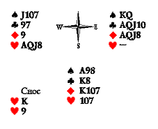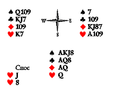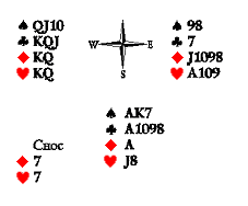 Мало того, что неизвестно, где брать шестую взятку (видно два козыря и три червы), так ещё и грозят червовые убитки. Однако шестерную можно выиграть, если препятствовать убитке. Для этого, взяв тузом червей, Юг должен пойти козырем, лучше всего — королём. Запад берёт тузом, и теперь приход к Востоку может быть осуществлён либо по козырной даме (что сразу же исключает червовую убитку, так как козыри кончаются на обеих руках вистующих), либо по бубновому тузу (что позволяет сделать убитку в черве, но даёт разыгрывающему компенсирующую взятку в бубне). Обратите внимание, что, если переложить бубновую даму Западу, вистующие могут безболезненно передаться по тузу бубён, убить черву, но тогда пропадает старший козырь Востока, который будет «изведён» третьей, неиграющей бубной Юга. Расположение треф в этом раскладе таково, что вистующие, как кажется, не могут сыграть и на опережение в козырях: после трефовой атаки и двукратного козыряния Восток получит ход и вынужден будет ходить в черву, а у Юга достаточно червовых приёмов для того, чтобы выработать себе взятку на бубнового короля. Своя игра? Если только Восток своевременно не разблокируется в козырях. После трефовой атаки Юг ходит королём пик, а Восток сносит даму пик (!). Запад продолжает трефой. Теперь уже Юг не может сдаться последним козырем, так как Запад, взяв валетом, доберёт две трефы. Приходится доставать пикового валета червой, после чего Запад ходит в трефу, наводя «бесполезный» сюркуп. Однако одного оставшегося червового приёма Югу для розыгрыша бубны уже недостаточно. Без одной.