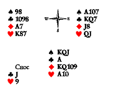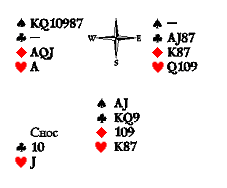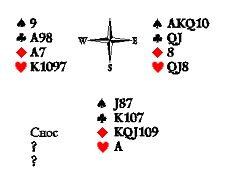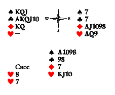 Взять три бубны и одну пику — недостаточно для подсада. Где поискать кладущую пятую взятку? Нужно попытаться ещё убить одну трефу. Для этого надо начать с треф. Получив ход на туза пик, пойти бубновой семёркой (чтобы не наиграть взятку в бубне), перебить с руки Запада любую карту Юга, убить трефу и отойти червой, ожидая ещё две взятки в бубне. Без одной.