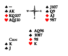 Может быть, следует начать с треф, а на короля пик сбросить с руки Востока даму, чтобы сохранить козырной приём в руке Запада. В этом случае Юг окажется перед неразрешимой задачей: