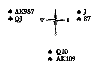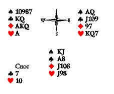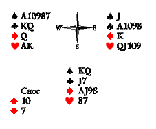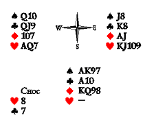 Пять козырей дадут Югу пять взяток, а туз с королём бубновые— ещё две. Если в сносе две пики или пика с червой, ничего сделать нельзя. Но если разыгрывающий снёс две червы, то можно навести сюркуп по пике на козырную десятку, вырабатывая себе четвёртую взятку. Полный расклад: