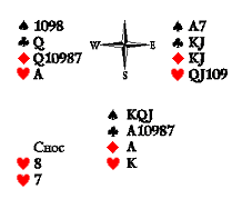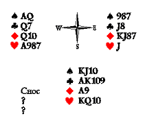 Предположительно, это девятка бубён и одна из десяток — пиковая или червовая. При любом из этих двух сносов у вистующих есть план, позволяющий избежать угадывания: убить черву, перейти по пике, добрать пику и убить третью черву валетом — даже если третья черва окажется в сносе, у Запада вырабатывается взятка на козырную даму (к сожалению, отложившийся синглетный валет червей не позволяет узнать наверняка о сносе червовой десятки — Юг может отдать короля и даму на первых двух кругах розыгрыша червы, сохраняя десятку как старшую карту в масти). Однако этот план нельзя назвать безопасным. Существует вариант сноса, который мы до сих пор не рассматривали: две пики. В этом случае добор второй пики приведёт к потере инициативы: ход попадёт к разыгрывающему, который незамедлительно отберёт козырей и легко возьмёт шесть взяток. Поэтому вистующие должны пренебречь возможностью убитки третьей пики (тем более что, если на руках у Юга есть три пики, значит, на третьем червовом круге точно наводится сюркуп и потерянная убитка пик возвращается в виде козырной взятки, а снос двух червей кажется невероятным) и сразу идти на убитку червей.