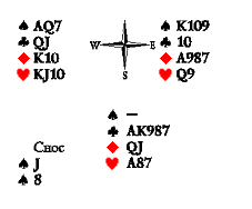 Первый ход Запада — королём пик. Восток бьёт королём треф, от Юга падает пиковый туз. Добирает ли Восток козырного туза или нет, он сюркупит Юга ходом в черву.