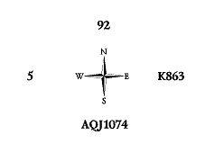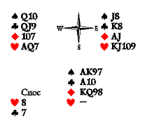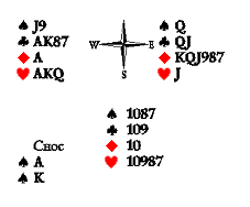 Атака дамой пик. [170] Взяв даму пик королём в руке, разыгрывающий козырнул тузом и обнаружил отсутствие козырей у Востока. Появилась задача, на первый взгляд, неразрешимая: отдать не более одной взятки на четвёртые даму с валетом, лежащие «за» тузом и королём. Но оказывается, при определённых раскладах можно провести элиминацию остальных мастей и впустить Запада, заставив его ходить в козырную вилку. Юг отобрал туза пик и убил третью пику в руке. Затем отобрал короля и туза червей и убил третью черву на столе. Потом отобрал две трефы, а третью убил в руке. Теперь он вышел с руки червовой десяткой. Запад вынужден поставить валета, чтобы не отдать взятку на козырную десятку: