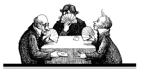 Рассмотрим вопрос в общем виде. Разыгрывающий, сколько бы он ни заказал, как правило, имеет более сильную руку, чем вистующие в совокупности. Он, располагая всего лишь десятью картами на руках, собирается взять не менее шести взяток, а вистующие, имеющие в сумме вдвое больше карт, должны постараться взять только оставшиеся четыре взятки (а то и три, две или одну). Как правило, у разыгрывающего есть длинная масть, которую он назначил козырем, и старшие карты, если не во всех, то, по крайней мере, в одной или двух других мастях. Единственное преимущество вистующих заключается в том, что они действуют сообща и пытаются оказать на разыгрывающего давление объединённой силой своих рук.