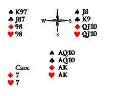 Разыгрывающий берёт тузом и ходит валетом бубён, пропуская на столе. Восток берёт дамой и проводит следующие вычисления: сила партнёра составляет 7–8 очков. [174] У него есть дама и валет пик, а также туз бубновый. Это 7 очков. Следовательно, ни в черве, ни в трефе фигур у него нет. В пике у Запада и Юга по четыре карты. Предложенный Западом план виста сулит по две взятки в пике и бубне. Разыгрывающий в этом случае возьмёт четыре бубновых, две пиковых, две трефовых и одну червовую взятки, выполняя таким образом контракт. Но ход бубновым валетом говорит о том, что у Юга изначально было не более двух карт в бубне, и, следовательно, он имеет единственный приход на стол к отработанной бубне по тузу червей. Выяснив такую важную деталь, Восток ходит червовым королём, которого разыгрывающий, закусив губу, вынужден пустить, так как в противном случае он лишился бы четырёх взяток в бубне. Осуществив этот «манёвр Мерримак», Восток продолжает пикой, чтобы получить перечисленные выше четыре взятки в пиках и бубнах.