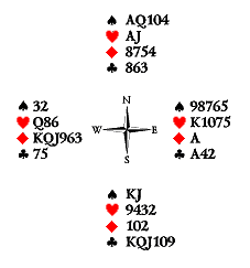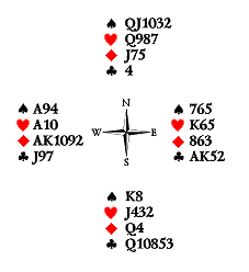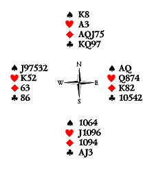 Имеет ли Север какой-нибудь приём? Это весьма сомнительно, однако, если у него есть бубновая фигура, то в случае короля — проблем нет; но если это вторая дама, то единственная возможность посадить контракт — снос туза бубён на третьем трефовом раунде.