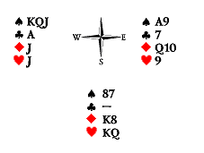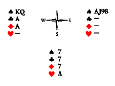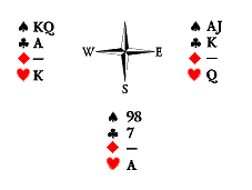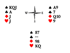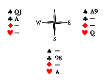 Счёт правильный — Юг и Восток могут взять пять взяток из шести. Запад контролирует пику и трефу, а у нас есть угрозы в обеих этих мастях. Сквизующей картой может стать либо черва, либо бубна. Которая из них? Черва, поскольку она находится в руке напротив двухкарточной угрозы. Две бубны нужно отобрать немедленно, а затем пойти червой и «удавить» Запада второй червой. Если мы сыграем картами в другой последовательности, то на вторую черву Запад снесёт валета бубён, а Восток вынужден будет решать проблему сноса одной из чёрных карт уже на этой стадии розыгрыша. Что бы он ни снёс, сквиз будет разрушен. Достаточно заменить девятку бубён Юга на короля той же масти, чтобы проблема последовательности ходов отпала: