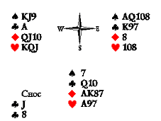 Когда Запад сносит валета бубён на вторую черву, Восток сбрасывает бубновую даму. Юг дважды ходит в бубну, и Восток выбирает снос после Запада.