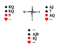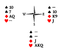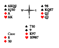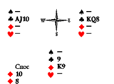 Разыгрывающий может насчитать у себя три козырные взятки и две взятки на тузов. Шестую взятку теоретически можно получить либо на даму треф, либо на четвёртого козыря, если выбить козырного короля Запада третьей бубной или третьей трефой. Но от второго варианта вистующие уже защитились и доберут козырного короля сразу же, как только получат ход. Остаётся дама треф, но для получения на неё взятки нужно вынудить вистующих ходить в трефу. Как это сделать? Нужно взять козырь тузом и немедленно отойти мелкой трефой. Вистующие доберут короля пик (так как появилась угроза, что мы его достанем третьей трефой) и пойдут либо в черву, либо в бубну, так как ход в трефу наигрывает нам взятку. Первую бубну нужно обязательно пустить (если разыгрывать масть придётся самому, то первый ход нужно сделать снизу), производя корректировку отдач и подготавливая классическую концовку: