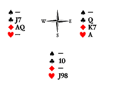 Если он снесёт туза треф, вистующие возьмут ещё две взятки на девятку треф и бубнового туза; если же он решит расстаться с «половинкой» бубнового марьяжа, Восток пойдёт в бубну, справедливо полагая, что дама треф была последней картой этой масти у Юга и, следовательно, туз треф у Запада, после чего туз и валет бубён возьмут две последние взятки. Без трёх.