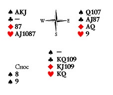 В последнем случае мы можем не дать больше взяток, устроив сквиз. Пойдём козырной дамой. Что снесёт Юг? Если десятку треф, продолжим тузом и валетом треф и отдадим последнюю черву тому, у кого туз червей. Если же Юг сносит черву, то ходим девяткой червей, а трефовую вилку держим на случай, если у Юга остались туз червей и K10 в трефе. В реальной жизни у Юга оказался марьяж червей. А полный расклад выглядел так: