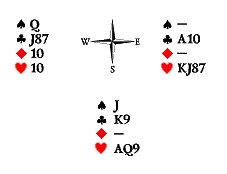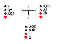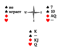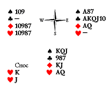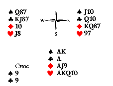 Единственный шанс получить седьмую взятку — заставить вистующих наиграть трефу. Но для этого нужно лишить Запада его единственного червового отхода, пока он ещё имеет пиковый приём. После отбора двух козырей Юг пошёл валетом пик. Запад вынужден отойти червой, чтобы не наиграть пику или трефу. Взяв козырем, Юг ходит тузом пик и мелкой пикой, впуская Запада, который вынужден теперь наиграть трефу.
