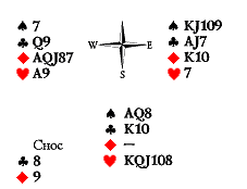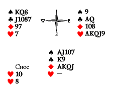 Ход Востока последней трефой вызывает у Юга вопль отчаяния: он вынужден снести последнюю черву и, получив свою пику, наиграть бубну. Восемь взяток.