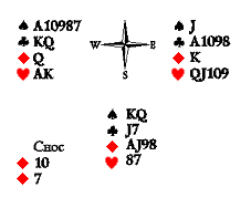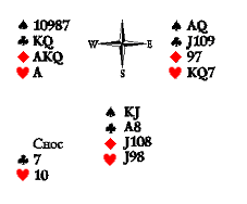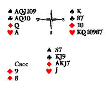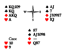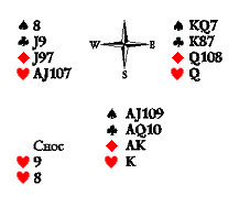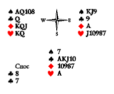 Очень похожая ситуация у нас уже встречалась в этой главе. Только в предыдущем случае торговли до шести червей Юг вистовал втёмную против восьмерной игры. Не имея проблем с ходом и представляя себе одномастную руку Востока без защитных ценностей в других мастях, Юг атаковал бубновым тузом и вторым ходом навёл сюркуп на синглетного короля пик. Восток догадался ответить в черву, и Запад вынужден был отдать ещё две трефовые взятки.