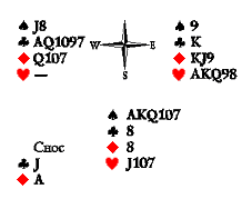 Перехват тузом кажется очевидным, несмотря на то, что дама принадлежит Югу, единственному оппоненту, который представляет опасность (Восток уже проиграл распасовку). Но как быть с трефой? Нужно ли опасаться того, что Юг после того, как вы вернёте ему семёрку бубновую, прорежет ваши KJ8 в этой масти? Зададимся вопросом: где находятся старшие трефы — туз и дама? Туза у Востока точно нет, иначе он не играл бы распасовку, а сказал раз (имея