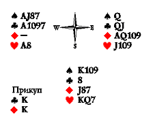 Что делать Западу? Восток первым ходом отобрал даму пик и больше хода в пики не повторил (не исключено, что дама была синглетной). В трефе у него изначально были QJ или KQJ. Вероятно, у него осталась одна черва (восьмая). Если у Востока нет отдачи в бубне, то мы, взяв одну-единственную взятку, проиграли распасовку, отпустив Юга с нулём. Приходится брать лишнюю — чтобы выиграть! Перебиваем валета треф тузом и отдаём Югу взятку в пиках (Восток сносит бубновую даму). Юг, не добирая пик, отвечает бубновой семёркой и получает возврат бубновой девяткой. Итог: W — две взятки; E — пять взяток; S — три взятки. Полный расклад был таким: