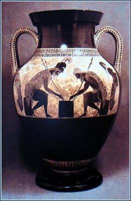Аттическая краснофигурная ваза с изображением Ахилла и Аякса, играющих в кости (Гомер «Илиада»). Около V в. до н. э. Керамика. Высота 53 см. Ватикан, Рим