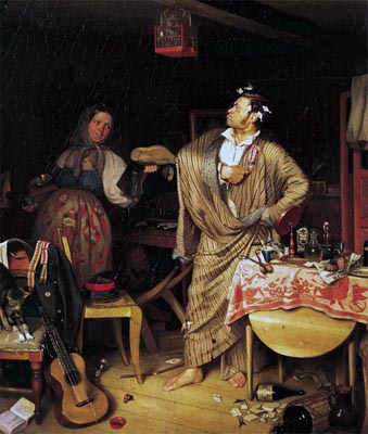Днём ему на службе надо Всё здоровье убивать, Вечерком же вся отрада В преферанчик поиграть; Как себя он утомляет, Вскочит с утренней поры: То законы изучает, То все правила игры. Чтоб пополнить недостатки, Надо всё предпринимать: Если в службе взятки — гладки, Преферансом можно взять; И дай Бог! Чтоб муж поправил И дела и наш удел, Чтоб ремизов век не ставил, А в малине всё сидел.П. А. Федотов «Свежий кавалер (Утро чиновника, получившего накануне первый крестик)». 1846 г. Холст, масло 48,2 x 33,6 см. Государственная Третьяковская галерея, Москва