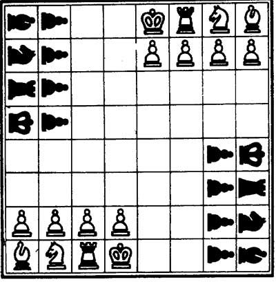 Древнеиндийские шахматы, или чатранг, — игра четырёх человек. На рисунке — первоначальная расстановка фигур
