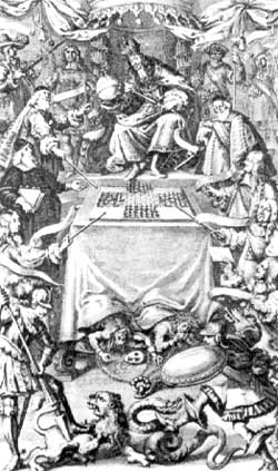 Аллегорический рисунок на обложке изданного в 1664 г. в городе Ульме трактата о шахматах К. Вейкмана изображает игру в шахматы вчетвером — так называемую «королевскую игру»