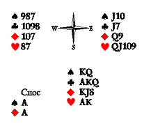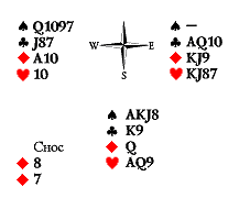 Условие: Запад заказал мизер (к тайному неудовольствию Юга). Ход Востока. Первые отрицательные эмоции вистующих, возникшие после того, как Юг выложил на стол свои старшие фигуры во всех мастях, уступили место поиску оптимального плана подсада.