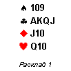 Но и на распасовку очень хороший прогноз — одна взятка (или их вообще не будет). Если вы возьмёте одну взятку, выигрыш на распасовке составит 15 вистов; если ни одной взятки — выиграете 32,5 виста (10 запишете в пульку, 25 — с горы). Есть смысл подумать.