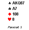 В предыдущем параграфе уже рассматривался расклад с пятью гарантированными взятками в одной масти (расклад 2). Прогнозировался проигрыш, правда, небольшой (П=3 виста). При таком прогнозе можно смело торговаться до своей масти (в приведённом раскладе — до шести червей). А можно ли торговаться на пяти гарантированных взятках до контракта на седьмом уровне? В этом случае прогнозируется существенный проигрыш (П=66 вистов). Очевидно, такое решение не имеет смысла.