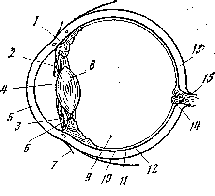 Окраска радужной оболочки — наследственный признак, передача его потомкам подчиняется особым закономерностям. В центре оболочки имеется круглое отверстие — зрачок. Радужная оболочка играет роль диафрагмы: она может сокращаться и расслабляться, изменяя величину просвета зрачка, т. е. диаметр попадающего внутрь глаза светового пучка. Внутренняя поверхность склеры выстлана сосудистой оболочкой, обеспечивающей питание всех частей глаза. Внутренний слой, выстилающий глаз изнутри, носит название сетчатой оболочки, сетчатки, или ретины. Он-то и воспринимает лучи света, проникающие внутрь глаза. Задняя камера глаза заполнена прозрачным стекловидным телом (рис. 5).