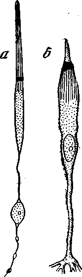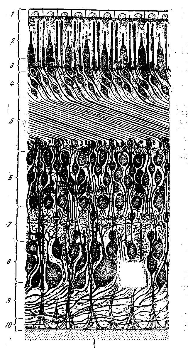 Сетчатка глаза человека имеет десять слоев (рис. 6), Наружный слой, примыкающий непосредственно к сосудистой оболочке глаза, состоит из клеток, заполненных черным пигментом и совершенно непроницаемых для света. Во втором слое расположены основные элементы восприятия света — нервные клетки, за форму названные палочками и колбочками (рис. 7). В последующих слоях ретины находятся биполярные, грушевидные и ганглиозные нервные клетки, а также последовательно соединяющие их нервные волокна. Отростки ганглиозных клеток, образующие десятый, самый внутренний слой сетчатки, прилегающий к стекловидному телу, собраны в один пучок — зрительный нерв, который выходит за пределы глазного яблока и направляется к мозгу. Таким образом, в сетчатке нервный импульс, возникший под влиянием светового раздражения, проходит по системе, состоящей из четырех последовательно связанных между собой нервных клеток, и лишь затем по зрительному нерву поступает в центры мозга.