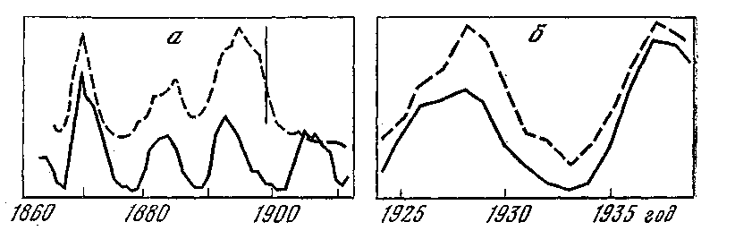 Рис. 9. Зависимость заболеваемости дифтерией (а) и острыми сердечными заболеваниями (б) от солнечной активности