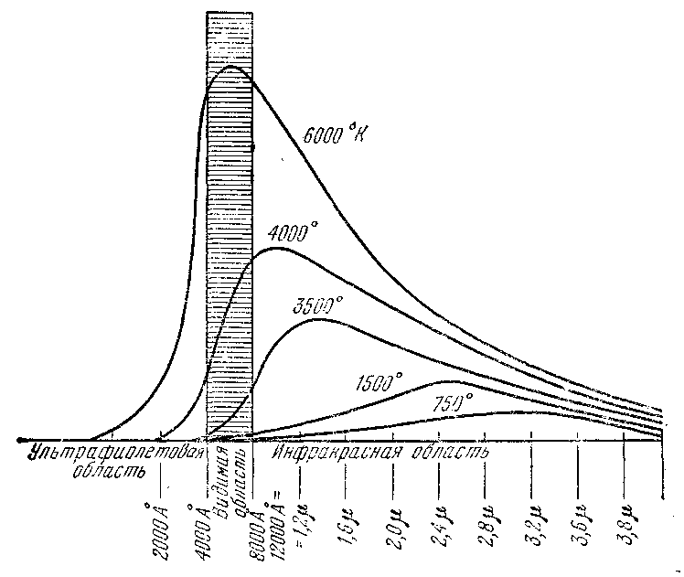 Таким образом, экономически наиболее выгодным был бы источник видимого света с температурой 6000— 7000° С. Современная техника пока не в состоянии создать такой источник. Но в природе он существует — это Солнце. Глаз человека приспособился к восприятию определенного диапазона электромагнитных колебаний не случайно, а в силу того, что он лежит в зоне максимума солнечного излучения.