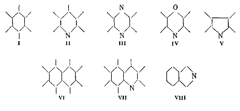 Бензольное кольцо (I) обычно повторяется в скелете красителя несколько раз, сочетаясь с другими кольцами: пиридиновым (II), азиновым (III), оксазиновым (IV), пиррольным (V). Встречаются и более сложные структуры из двух колец: нафталиновая (VI), хинолиновая (VII), бензопиррольная (VIII) и др.: