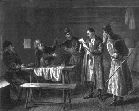 Григорий Отрепьев читает царский указ в корчме. Гравюра М. Рашевского с рисунка А. Земцова.